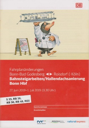 Ein 20-seitiges Heft im (ca.) DIN A5- Format liegt seit heute unter anderem in den Zügen der S23 / Voreifelbahn aus, in dem die Fahrplanänderungen zwischen Bonn Bad Godesberg und Roisdorf (- Köln) auf Grund der Bahnsteigarbeiten / Hallendachsanierung in Bonn Hbf vom 27. Juni bis 01. Juli 2019 aufgeführt werden: