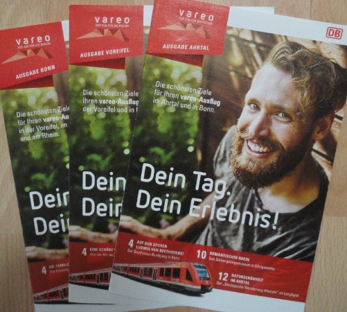 Seit kurzem liegen in den Zügen (u.a.) der S23 und auch im Reisezentrum im Bonner Hauptbahnhof die neuen Ausgaben des DIN A5- großen Heftchens "VAREO - Der Zug für die Region aus". Es gibt unter anderem die Ausgaben "Voreifel", "Bonn" und "Ahrtal". Alle enthalten wieder verschiedene - jeweils leicht unterschiedliche - Ausflugstipps entlang der jeweiligen Strecken: