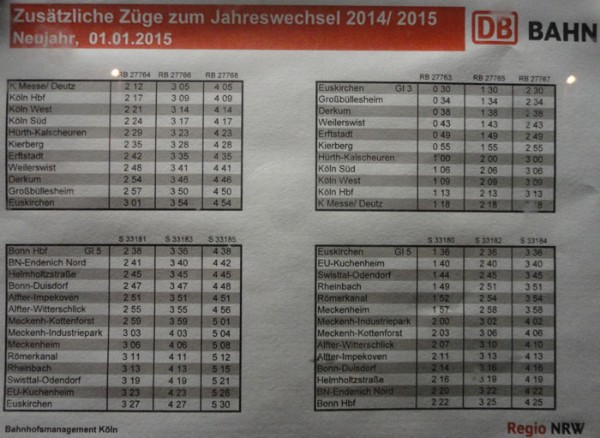 Unter der Überschrift "Sonderzüge in der Sylvesternacht" wird in der heutigen Ausgabe des Bonner "General Anzeigers" auf die zusätzlichen Züge auf den diversen Strecken in der Region - darunter natürlich auch auf der S23 - hingewiesen. Die Sonderfahrpläne gibt es auch unter der folgenden Adresse als Download: