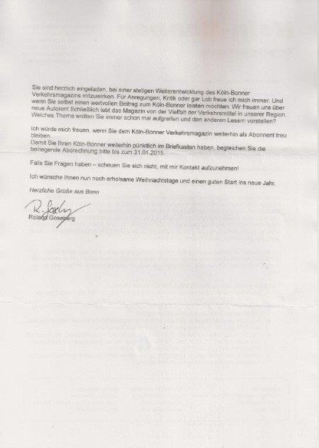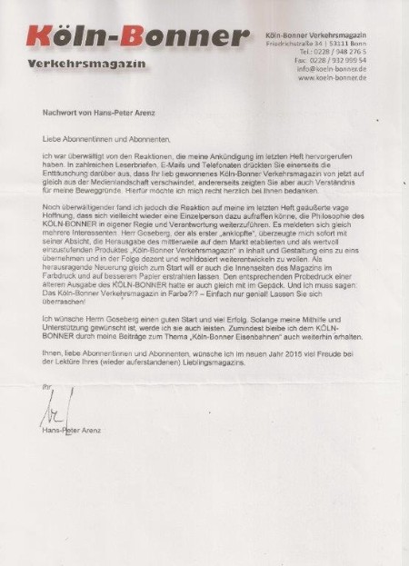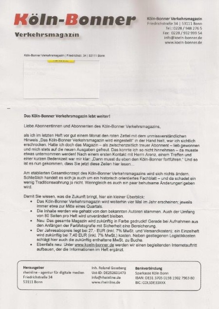 Post der positiven Art kam dann auch noch: am 03. November (siehe Bitte dort) mußte ich noch die Mitteilung veröffentlichen, dass die beiden letzten Ausgaben des "Köln-Bonner Verkehrsmagazin" erschienen sind und es das Heft zukünftig nicht mehr geben wird. Doch nun kam überraschend ein 3-seitiges Schreiben, dass es mit einem neuen Herausgeber doch wie gewohnt weitergehen wird!