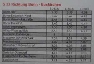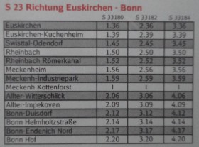 In der Nacht von Samstag (10.) auf Sonntag (11.) fand der gewohnte Fahrplanwechsel statt. Auch auf der S23/ "Voreifelbahn" gab es dabei ein paar kleine Änderungen bzw. Anpassungen. So fährt unter anderem der erste Zug in Richtung Bonn an Sonn- und Feiertagen von Euskirchen jetzt schon um 7.08 Uhr ab (nicht wie bisher erst um 8.08 Uhr). Auch findet an Samstagen jetzt ein längerer Halbstundentakt auf der Strecke statt.