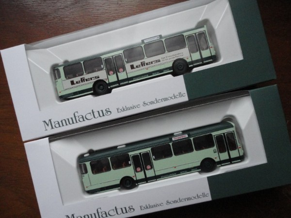 Zwei weitere Modelle in der Serie nach dem Vorbild von Bussen der Bonner Stadtwerke. In diesem Fall stellen die Nachbildungen im Maßstab 1:87 eine kleine Besonderheit dar, zwiegen sie doch zwei Mal das selbe Fahrzeug. Einmal im Zustand von 1986 (mit "Leffers"- Reklame) und einmal im heutigen Zustand als Museumsbus des "HVSWB" von 2016 (ohne Reklame). Beide Modelle erschienen in einer Auflage von jeweils nur 150 Stück und sind (derzeit - d. h. zum Zeitpunkt dieses Eintrags - noch!) nur beim "Spielzeugschotten" erhältlich. (Siehe dazu Bitte auch den Eintrag unter 17./ 18. September 2016). Weitere Bilder der Modelle gibt es natürlich auch wieder hier.