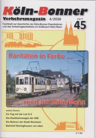 Die neueste Ausgabe des fantastischen "Köln-Bonner" (Ausgabe 4/2016 - Heft 45) landete im Briefkasten! Dieses mal geht es unter anderem um ein "Krokodil im Westerwald", wir erleben "Einen Tag mit der Lok D4", sehen "Köln-Bonner Farbraritäten" und machen einen "Kleiderwechsel". Natürlich finden sich auch in dieser Ausgabe die in jedem Heft vorhandene Buchbesprechung, die Leserbriefe und die "KBE-Chronik" (diese in diesem Heft allerdings zum letzten Mal . . .). Beigelegt findet sich auch wieder ein Blatt mit den Terminen November bis Februar und für Abonennten gibt es einen DIN A2- großen Wandkalender. Wie man nicht oft genug erwähnen kann: unbedingt zu empfehlen! Zu erhalten ist das Heft wie immer u. a. bei den Bonner Modellbahngeschäften und der Bahnhofsbuchhandlung im Hauptbahnhof, sowie selbstredend auch direkt beim Verlag: