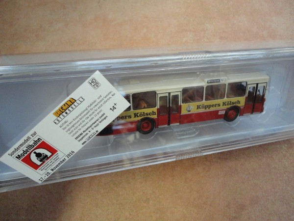 Von heute an bis einschließlich Sonntag (20.11.) findet in den Kölner Messehallen die "Modellbahn Köln" statt. Die Firma Brekina bietet/ bot an ihrem dortigen Stand ein limitiertes Messemodell ihres Mercedes Benz O305 in der Lackierung eines Fahrzeuges der "KBE (Köln-Bonner Eisenbahnen)" im Maßstab H0 für 25,-€ an: