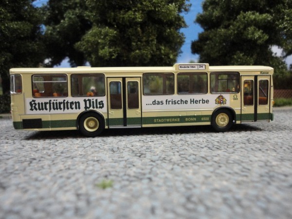 Vorbild ist das Fahrzeug mit der Nummer 021 und "Küppers Kölsch"- Reklame. Unterwegs ist der Bus auf der Linie "701" nach "Brühl-Heide".