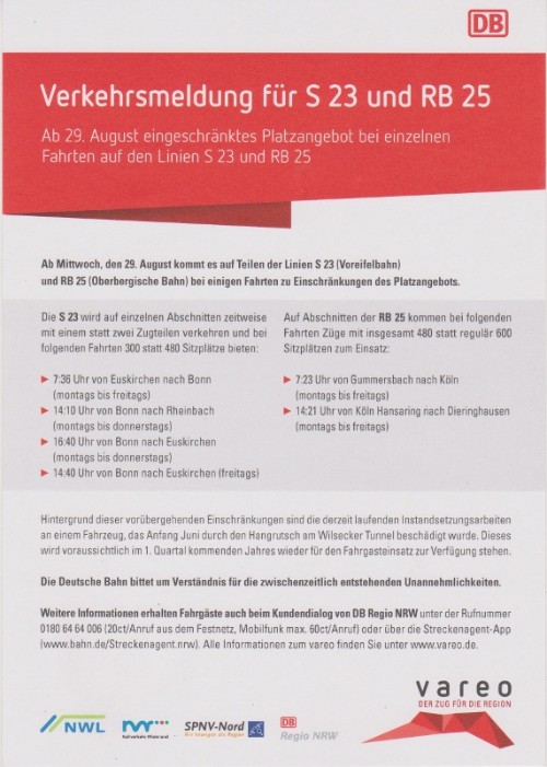 In der heutigen Ausgabe des Bonner "General Anzeigers" wird in einem kleineren Artikel unter der Überschrift "Weniger Plätze bei einzelnen Fahrten" darauf hingewiesen, daß es ab Mittwoch dem 29. August 2018 bei den Fahrten 7.36 Uhr ab Euskirchen (mo - fr), 14.10 Uhr ab Bonn (mo - do), 16.40 Uhr ab Bonn (mo - do) sowie um 14.40 Uhr von Bonn (fr) auf der Voreifelbahn/ S23 zu Einschränkungen des Platzangebotes kommen wird. Grund ist ein beschädigter und derzeit in Reparatur befindlicher Triebwagen.
