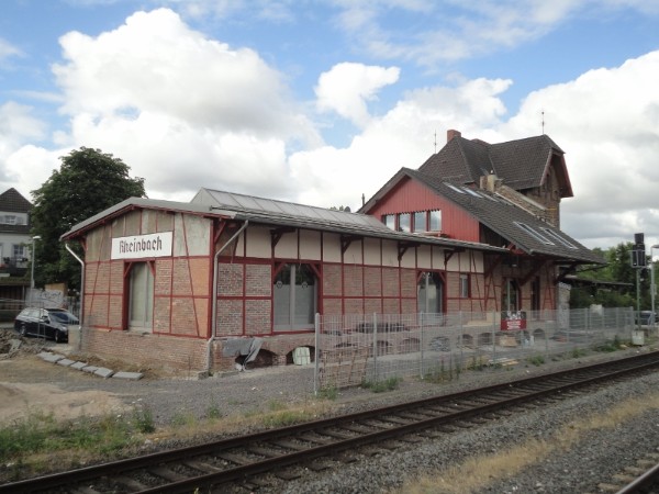 Schon seit einigen Wochen wird der langestreckte niedrigere Teil des Güterschuppens am Bahnhof Rheinbach renoviert/ restauriert. Neben der Neuverfugung der Ziegelsteine und Ausbesserung einiger Gefache, der Anlage eines Außenzugangs zum Keller unter dem ursprünglichen Schuppenteil, sowie der Bereinigung des direkten Umfeldes und dessen Einzäunung wurde dabei auch das alte Stationsschild auf der Stirnseite sorgfältig erneuert: