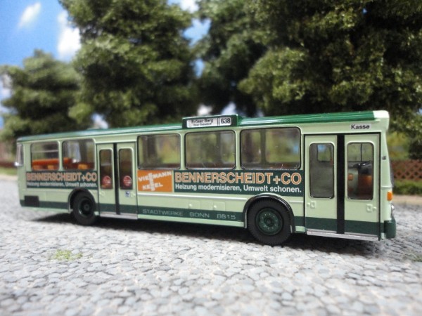 Von der Firma Brekina wird in den Neuheiten für "März/ April 2018" ein weiterer Bus der Bonner Stadtwerke angekündigt. Unter der Art.-Nr.: 50773 wird erneut ein Mercedes Benz O305 in der grünen Lackierung sowie Werbung für die Bonner Firma "Bennerscheidt + Co" im Maßstab 1:87 zum Preis von 35,90 € angekündigt. Unterwegs ist der Wagen dieses Mal auf der Linie 638 zum "Brüser Berg über Duisdorf" (Fahrzeugnummer ist bisher nicht bekannt):
