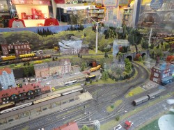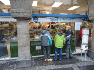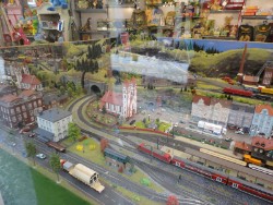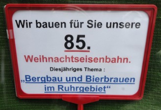| Eine sehr schöne - heutzutage leider nicht mehr allzu oft zu findende Tradition - wird seit Jahrzehnten von der Firma Puppenkönig in Bonn gepflegt: alljährlich entsteht in der Vorweihnachtszeit in einem Schaufenster des Spielwarenladens und vor den Augen der Kunden, eine Weihnachtsanlage, deren Motive ebenfalls jährlich wechseln! Auf dieser findet dann - nach der Fertigstellung - in der Weihnachtszeit durchgehend ein automatisierter Betrieb mit mehreren Zügen statt.