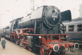 (Photo: R. Schwenker, Rheinbach) | Die bekannte Museumsdampflok 23 105 fuhr am 30. April 1996 am frühen Abend als Lz/ Lokleerfahrt von Koblenz kommend über Bonn nach Euskirchen, wo sie sodann die Nacht verbrachte, um am nächsten Morgen erneut als dritte Lok (Vorspann) an einen Sonderzug gehangen zu werden.  | 23 105 am 11 Mai 1996 in Koblenz/ Hbf.