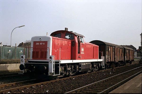 Baureihe V90/ 290/ 294: Die Lokomotiven der Baureihe wurden (und werden auch heute noch) auf der Strecke für Güterzüge eingesetzt. In den letzten Jahren wurden diese aber immer seltener, so daß es inzwischen nur noch einen "regelmäßigen" Güterzug nach Meckenheim Industriepark gibt (Odendorf durch ca. 9.00 Uhr) und in seltenen Ausnahmen mal einen zum Munitionsdepot (AWANST) bei Oberdrees.  | 290 167-6 am 11. März 1989 in Bonn- Duisdorf.