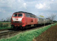 Baureihe V160/ 215/ 218: 215 Diese Lokomotiven ersetzten in den 80er Jahren die Loks der Baureihe 212. Die Baureihe 215 befuhr noch bis Mitte/ Ende der 90er Jahre mit Wendezügen - bestehend aus jeweils drei bis vier Silberlingen (inklusive Steuerwagen) die Strecke Bonn- Euskirchen. Im Einsatz waren diese Lokomotiven auf der Strecke über die Jahre in insgesamt mindestens drei verschiedenen Lackierungsvarianten/ -konzepten: altrot, ozeanblau-beige, neurot.  | |  | |  | 215 025 der EfW Eisenbahngesellschaft im Juli 2014, in der ursprünglichen Lackierungsvariante.