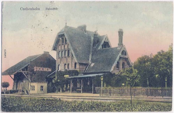 Der Bahnhof Cuchenheim auf einer nachkolorierten Postkarte - etwa 1912
