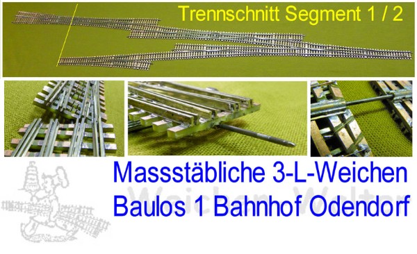 Langer Rede kurzer Sinn: die Weichen wurden nun komplett von Weichen- Walter (einem Kleinserienhersteller- siehe unter den Links) hergestellt. Die Weichenstrasse für das Segment II (Bahnübergang "Essiger Strasse") habe ich Anfang des Jahres bei ihm bestellt. Diese wird als komplette Weichenstrasse gefertigt, mit der Besonderheit, das die DKW zwischen Gleis 4 und 5 in der Mitte getrennt wird, da sie zur Hälfte auf dem Segment I (Empfangsgebäude) liegt!!!!