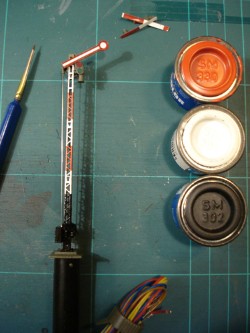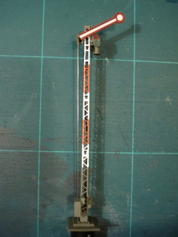 Jetzt schon abwechselnd weiß und rot. | | Und hier das fertig bemalte Signal mit den Farben. |