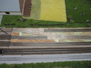 Die im rechten Bild linke untere DKW ist die auf Höhe mit dem Ende der rechten Weiche etwa mittig getrennte!!! Unten die ersten Bilder der - noch provisorisch - auf den Segmmenten eingebauten Weichenstrasse: