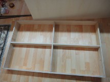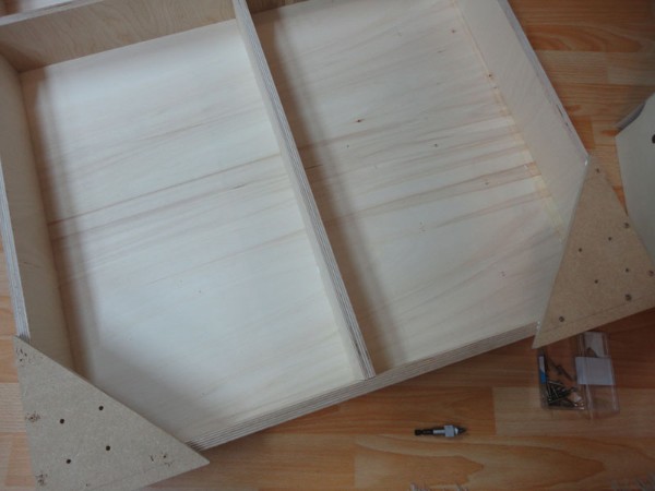 Die Rahmen der bisherigen 6 Segmente bestehen aus Multiplexbrettern in der Höhe von 10cm und einer Stärke von 1,5cm. Die Deckplatte besteht aus 6mm starkem Pappelsperrholz. Alle Holzteile wurden miteinander verleimt und verschraubt; die außenliegenden Schraubenlöcher wurden zudem leicht angesenkt, damit die Schraubenköpfe nicht hervorstehen.