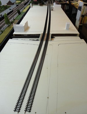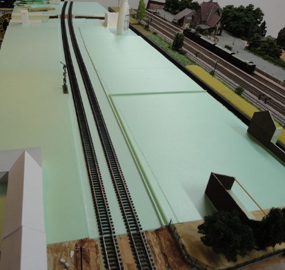 Unten ein Blick vom Bahnübergang die Gleise entlang zum Empfangsgebäude. Die hier zu sehenden Gebäude sind von mir erstellte "Im-Prinzip-Modelle". Diese entstanden mit Hilfe der auf den 1:87er Maßstab gebrachten bzw. selbstgezeichneten Pläne und dienten dazu zu zeigen, ob diese (die Pläne) im Prinzip korrekt bearbeitet waren und ob die Maße prinzipiell stimmig waren.