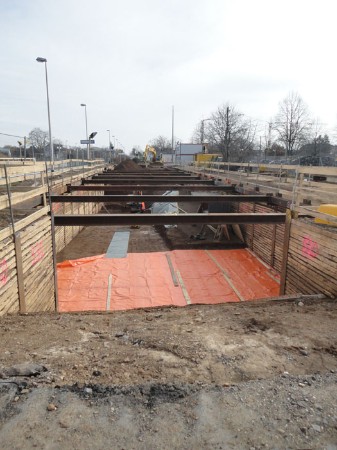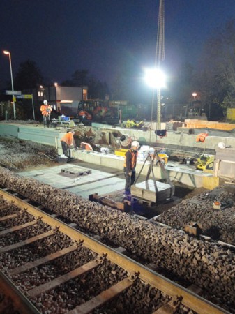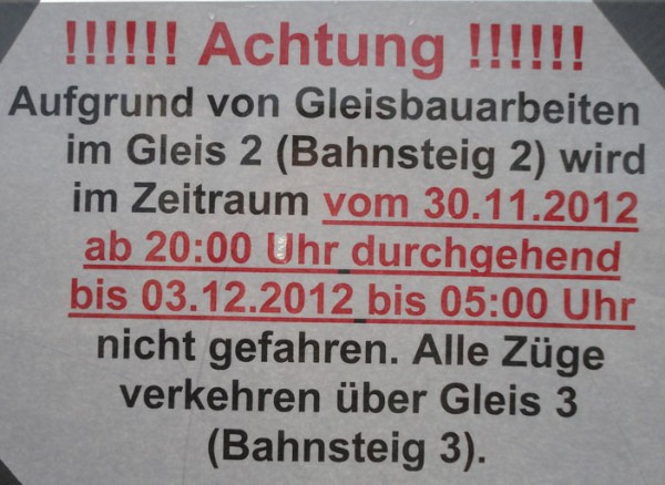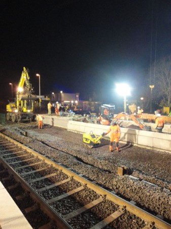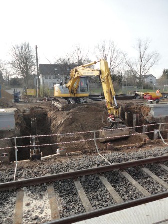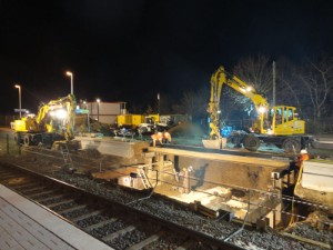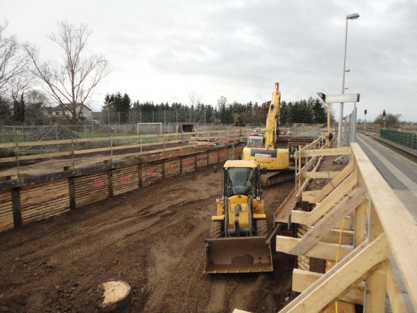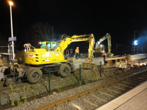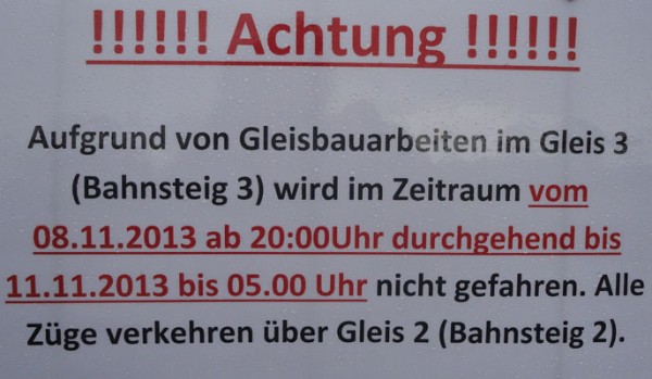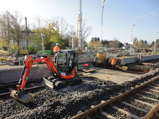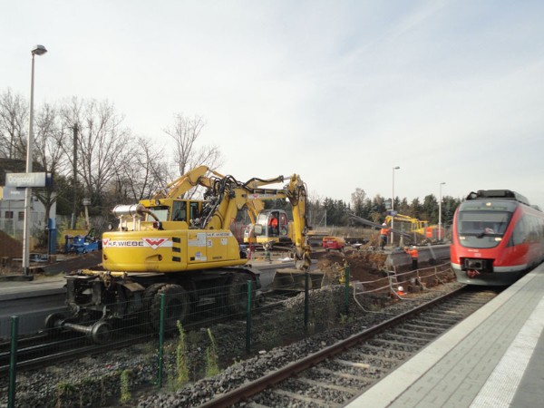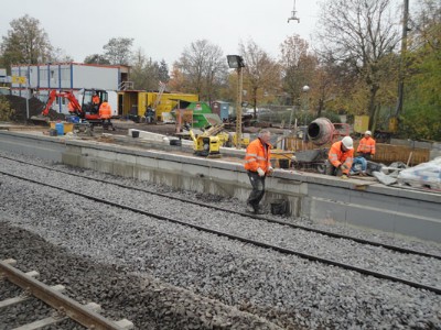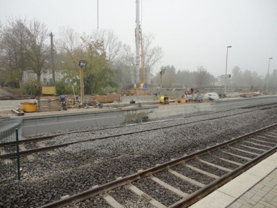 | Ein Wochenende später (16. & 17. November 2013) war dann auch die andere Bahnsteig-/ Gleisseite an der Reihe:  | Samstagvormittag, ca. 12.00 Uhr: Tunneldecke ist mit Teerpappe beklebt und rundherum wird Erdreich aufgefüllt und planiert. |  | |  | ca. 17.00 Uhr: während der Tunnel noch mit Platten belegt wird, wird gleichzeitig die Bahnsteigkante wieder aufgebaut.