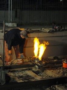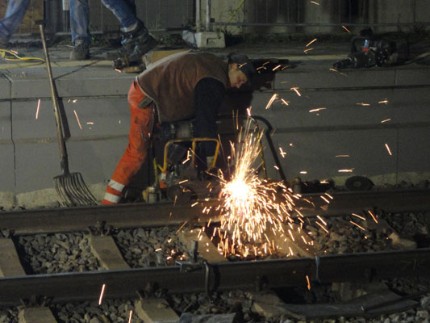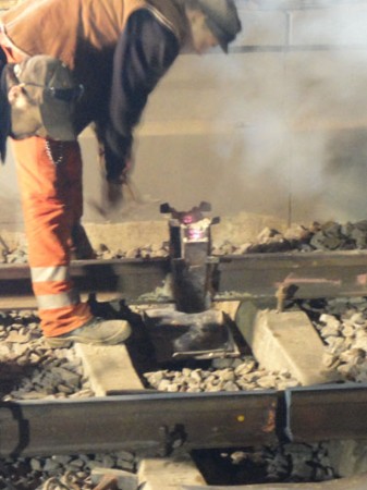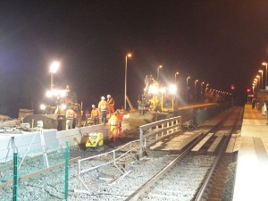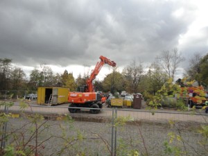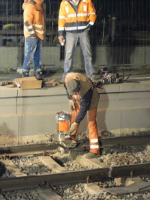|  | |  | Sonntagmorgen, ca.10.00 Uhr: die Schienen liegen wieder und der Schotter ist verteilt.