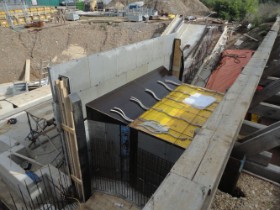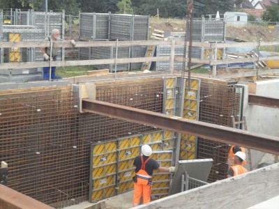 Oktober 2013:  | |  | |  | Verschalungsarbeiten. | | Der schon gegossene aber noch verschalte Tunnelmund.