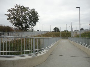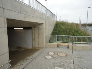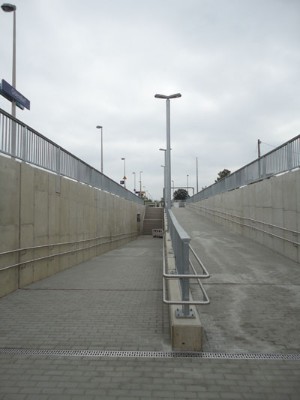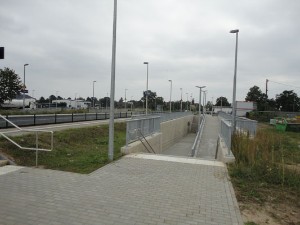 | | Die Rampe zum Fußgängertunnel auf der Seite des Gewerbegebietes.